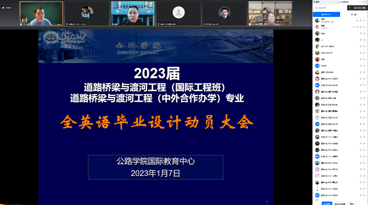 国际教育中心面向道路桥梁与渡河工程(国际工程班)及道路桥梁与渡河工程(中外合作办学)专业召开了2023届全英文毕业设计(论文)动员会。双语教学团队50余名指导教师及200余名学生参会。会议由国际教育中心副主任李鹏主持。
