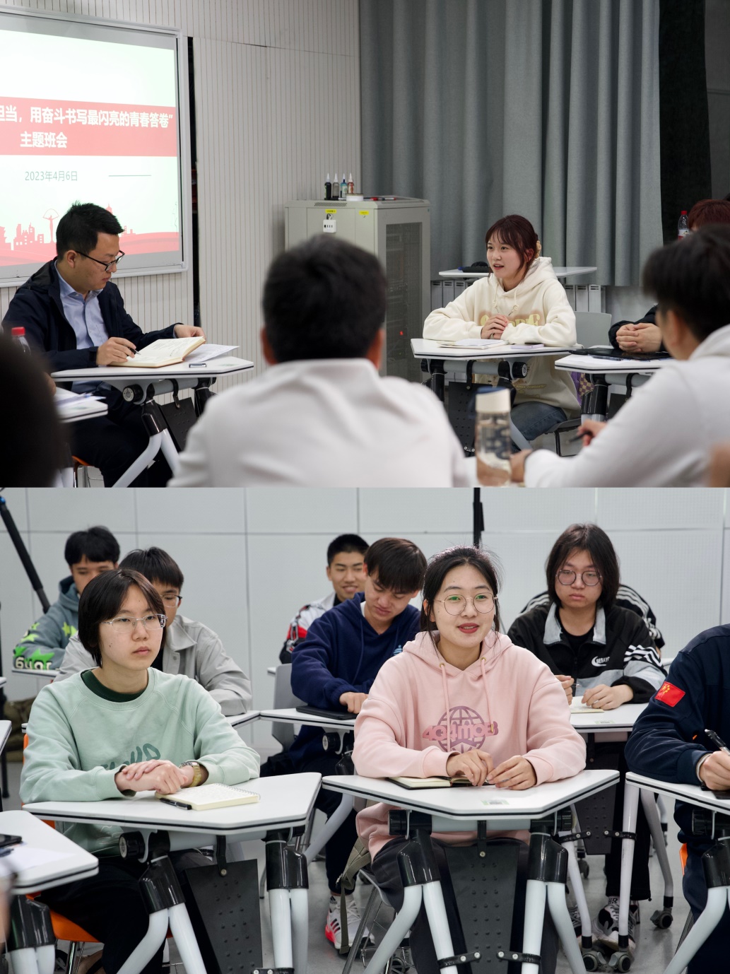 班会上,班长张友强、团支书孙朱旭分别从班级学风建设、团支部组织建设以及班级成员参与科创科研竞赛、志愿服务活动等方面介绍了班级取得的成绩。学生代表刘佳媛、熊昭文、王浩宇、田静、袁伟等围绕对疫情防控政策调整的认识、个人成长发展预期、“后疫情时代”个人职业生涯规划等分享了大学三年来的学习生活情况。陈志坚针对同学们分享的内容,从抗击疫情的信心和底气、凝聚抗击疫情的磅礴力量、发挥中国特色社会主义制度优势、为实现中华民族伟大复兴的中国梦凝聚精神力量四个方面,用丰富的事例与同学们分享了三年疫情防控中自己的体会,对同学们为维护校园安全稳定作出的贡献表示充分肯定,为广大青年在抗疫实践中所展现的良好精神风貌和优异表现点赞。