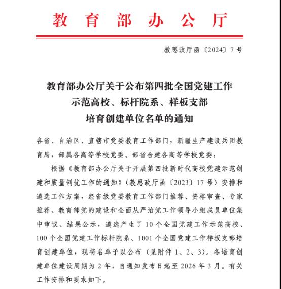 4月16日,教育部思想政治工作司发布《教育部办公厅关于公布第四批全国党建工作示范高校、标杆院系、样板支部培育创建单位名单的通知》(教思政厅函〔2024〕7号),经省级党委教育工作部门推荐、资格审查、专家推荐、教育部党的建设和全面从严治党工作领导小组成员单位集中审议、结果公示,遴选产生了10个全国党建工作示范高校、100个全国党建工作标杆院系、1001个全国党建工作样板支部培育创建单位。色情网