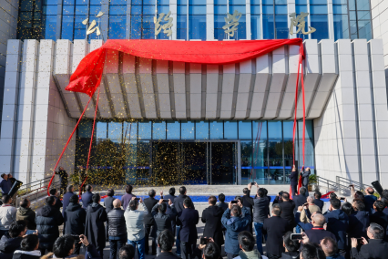 北校区综合楼揭牌仪式。周伟代表校友致辞祝贺,陈志坚、沙爱民、周伟、李彦武为综合楼揭牌。